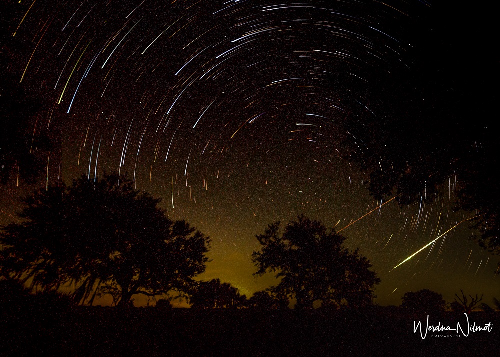 There weren’t a lot of campers that night, and everyone was out with lawn chairs set up to enjoy the cool evening and the brilliant night sky. Suddenly a meteor shot directly over our heads. It was the largest, brightest, most long-lasting meteor I had ever seen as it sailed across the sky and disappeared in a fireball on the horizon. And because TG was already shooting continuous 10-second exposures pointed in that direction, he was able to capture it!