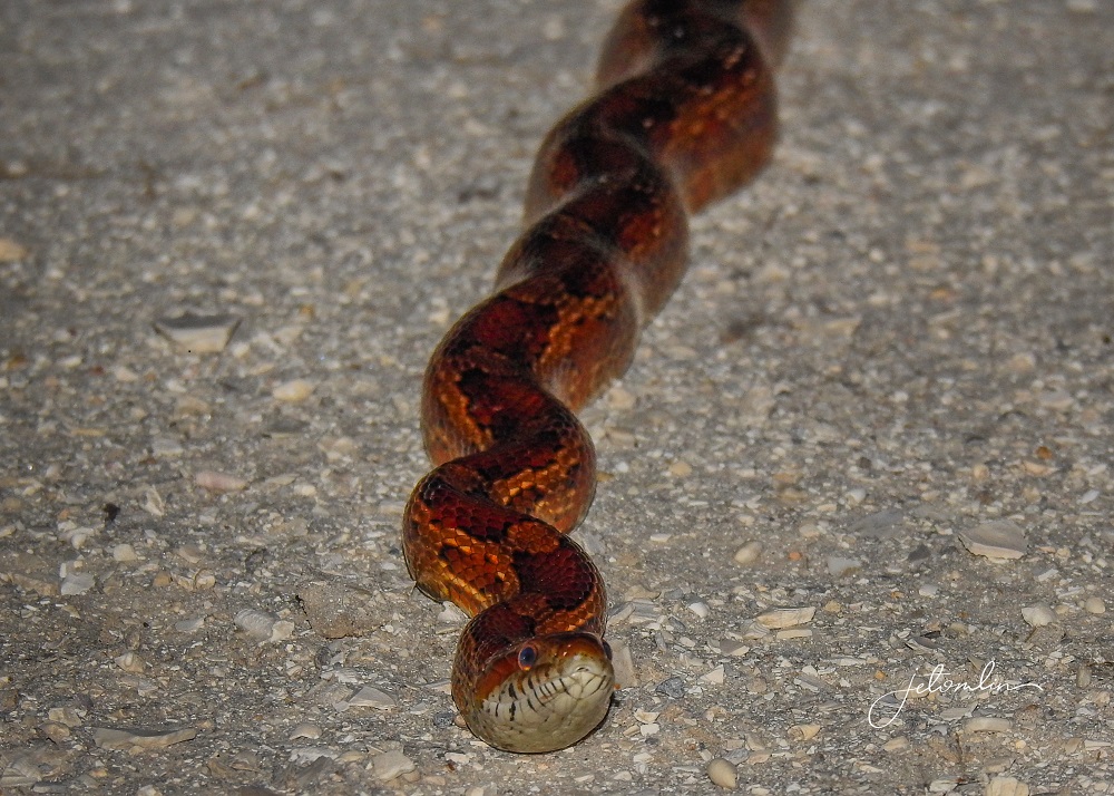 I’ve been meaning to do one for a while, so around dusk I drove the five miles to the park entrance. On my way I spied a beautiful red rat snake,