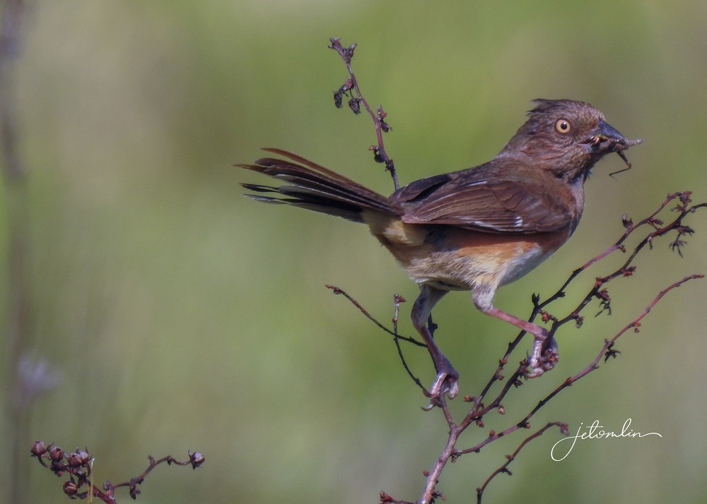 On my walk I saw a beautiful female eastern towhee enjoying a little snack