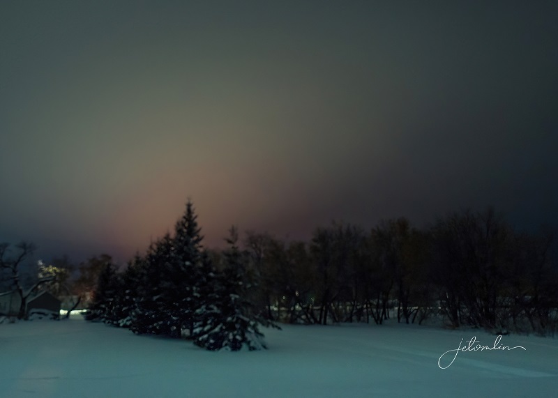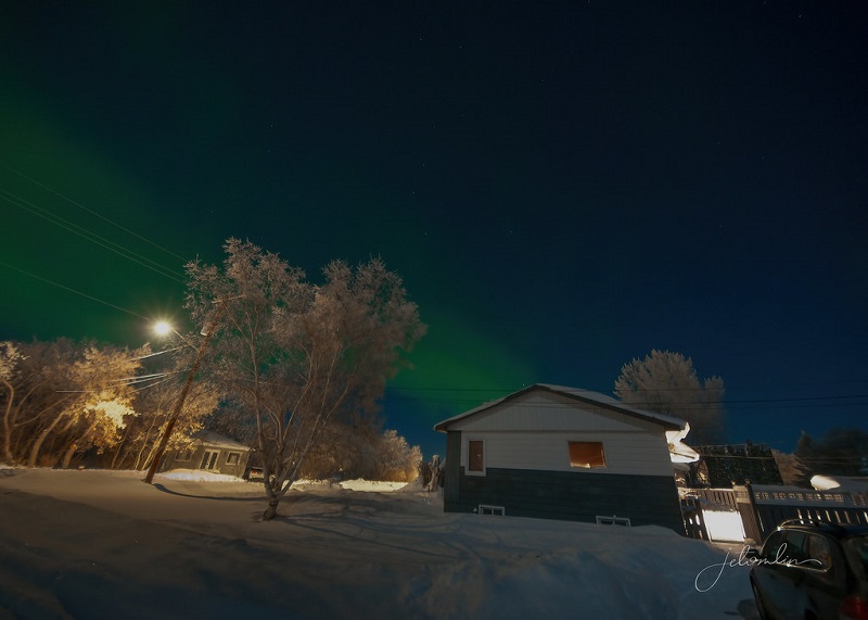 So, imagine our surprise and delight when we peeked out the window later that evening and saw streaks of green in the sky. What was predicted to be a night of 100% cloud cover gave us our sixth show – this time lighting up the snow-covered houses like a winter fairyland!