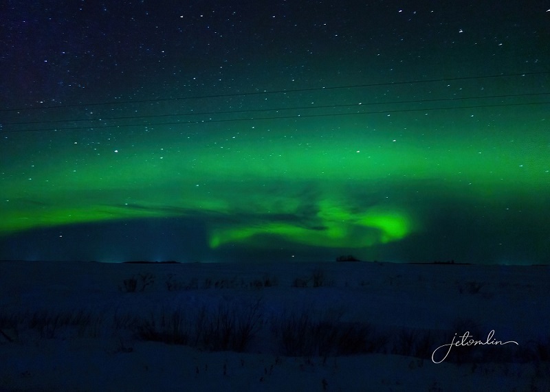 That evening, the sky was again overcast, with only a hint of green poking through the clouds. The glorious nights earlier in our stay had spoiled us, and we didn’t bother putting on our winter gear to go outside in the cold. However, the forecast showed clear skies at 2 am. When the alarm went off, we peeked outside: the Lady was dancing again! We bundled up for a short 45-minute photo session and added to our aurora count, which now stood at eight nights!