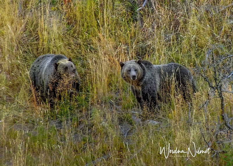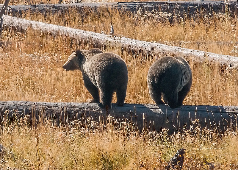 One afternoon we received intel that Yellowstone’s celebrity grizzly bears, “Raspberry” and her cub, “Jam” had been spotted in the eastern section of the park. Raspberry is a 15-year-old sow with a history of keeping her cubs longer than usual. Typically, around two years bear cubs are on their own so that the mother can mate again, but in the spring of 2022, Raspberry and 2 1/2-year-old Jam were still seen together.